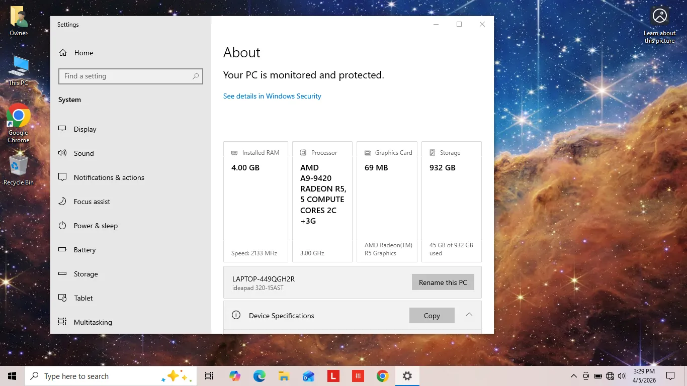 - Processor: AMD A9-9420 – 3.0-3.6 GHz